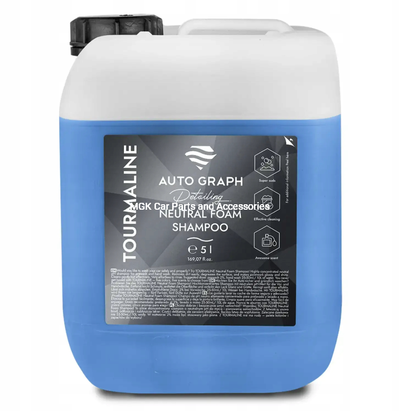 AUTO GRAPH TOURMALINE – TO SILNIE SKONCENTROWANY SZAMPON O NEUTRALNYM PH DO MYCIA I PIANOWANIA SAMOCHODÓW. Z ŁATWOŚCIĄ USUWA BRUD, ODTŁUSZCZA I NABŁYSZCZA LAKIER. CZYŚCI DELIKATNIE, ALE ZARAZEM EFEKTYWNIE. BARDZO ŁATWY DO WYPŁUKANIA. ZALECANE DAWKOWANIE 25-50 ML / 10 L WODY. W ROZTWORZE 2% MOŻE BYĆ STOSOWANY JAKO PIANA. Z TOURMALINE NIE MA NUDY – PALETA KOLORÓW I ZAPACHÓW DO WYBORU!