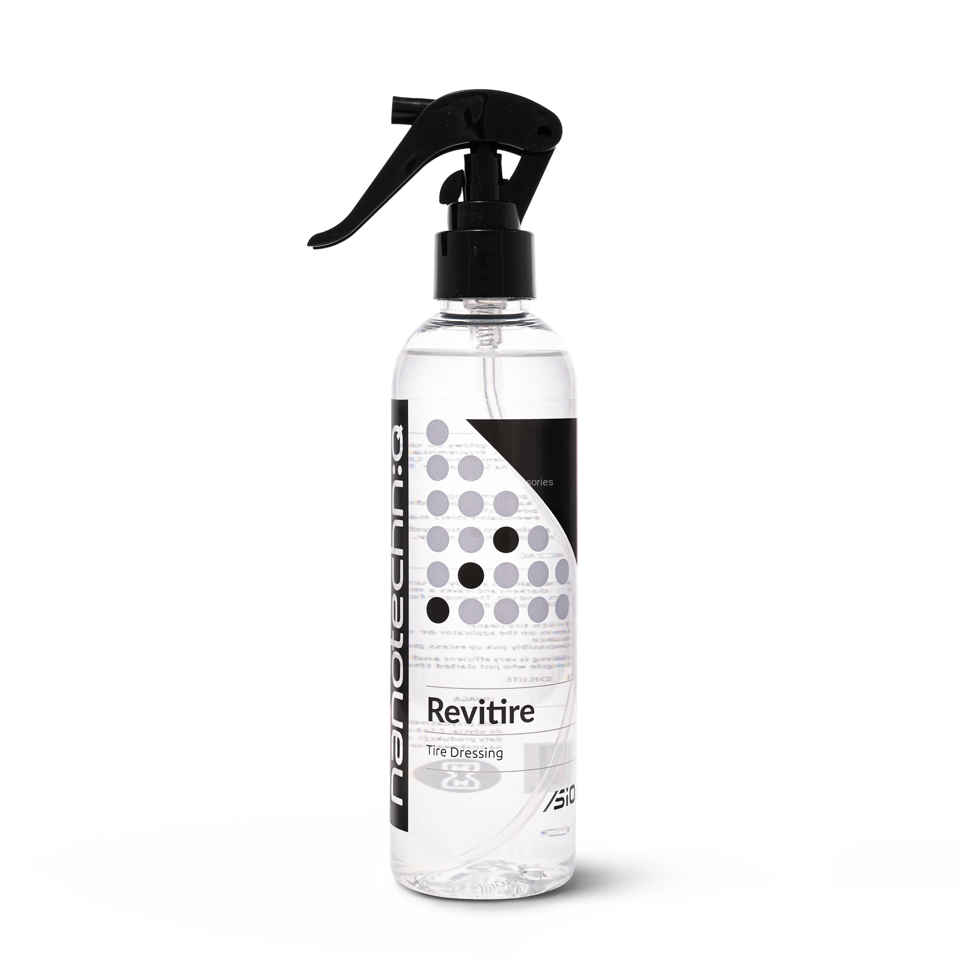NANOTECHNIQ REVITIRE TO PROFESJONALNY DRESSING DO OPON I ELEMENTÓW GUMOWYCH, OPARTY NA TECHNOLOGII SiO₂, KTÓRY ZAPEWNIA DŁUGOTRWAŁĄ OCHRONĘ ORAZ ELEGANCKIE, MATOWE WYKOŃCZENIE.