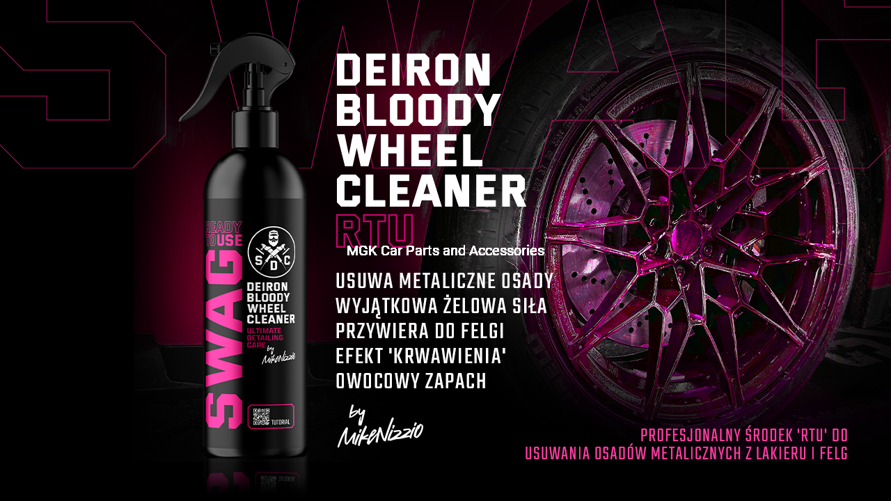 ODPOWIEDŹ: TO PROFESJONALNY „KRWAWIĄCY” DEIRONIZER GOTOWY DO UŻYCIA. USUWA METALICZNE OSADY, PYŁ HAMULCOWY I LOTNĄ RDZĘ Z FELG ORAZ KAROSERII.